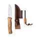 Bladet är tillverkat av ett högkvalitativt stål som håller skärpan länge, vilket innebär färre slipningar och mer tid ute i det fria. Kniven levereras i en brun läderslida med säker knappstängning och en smart ficka för tändaren.